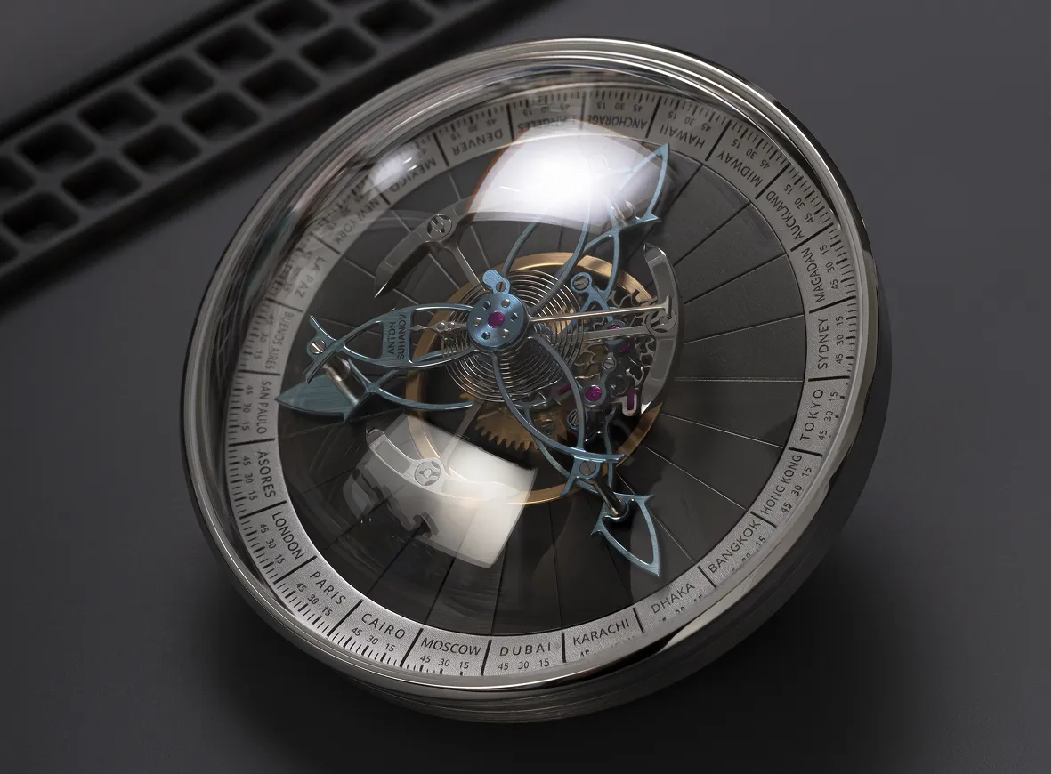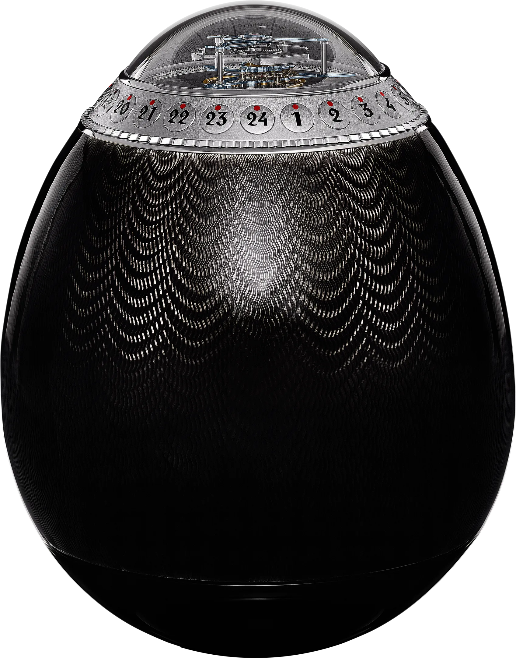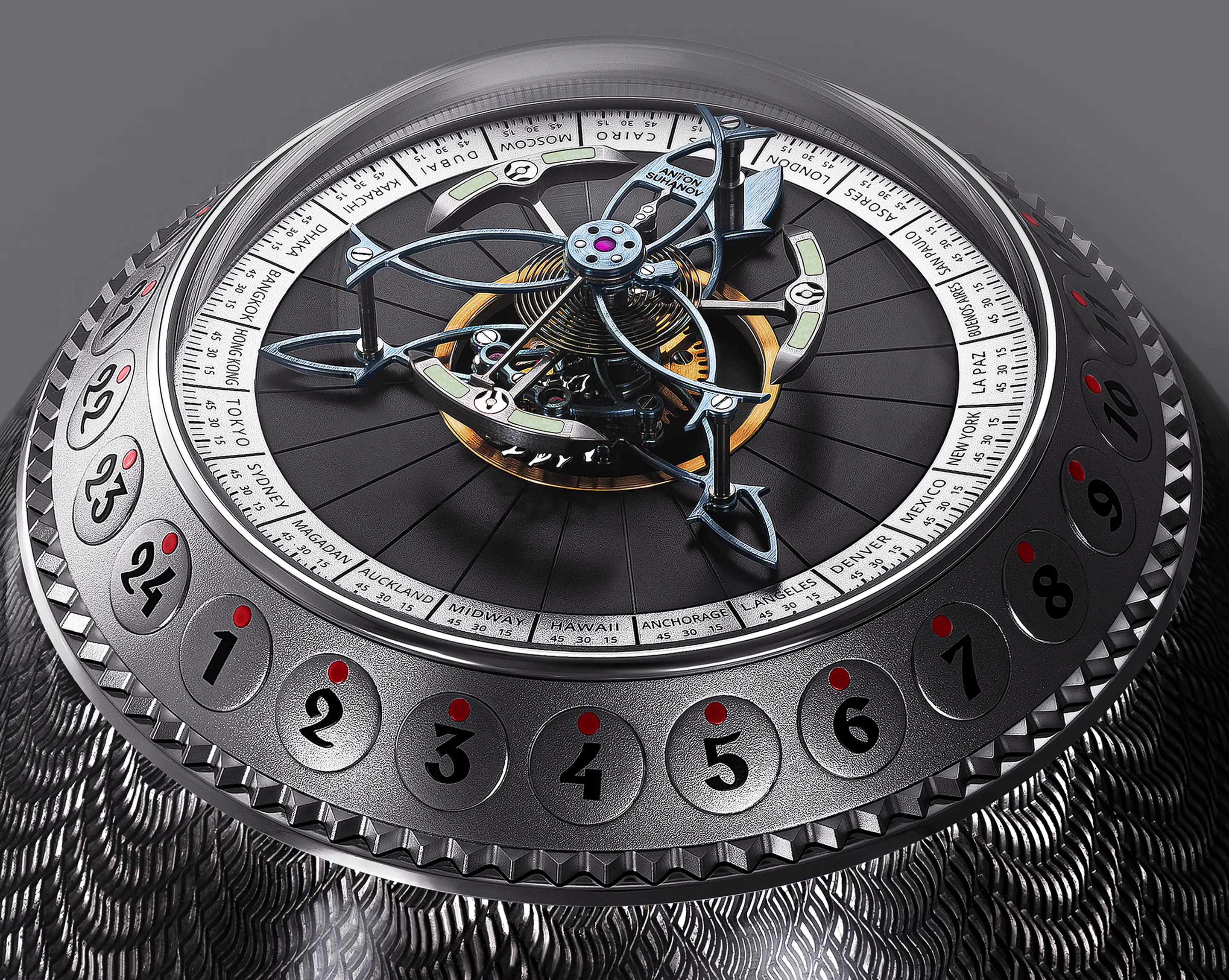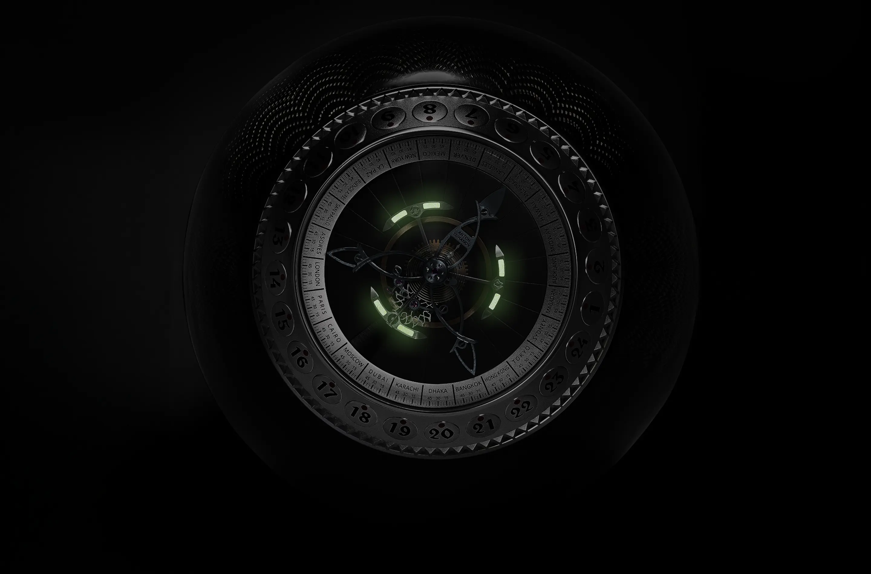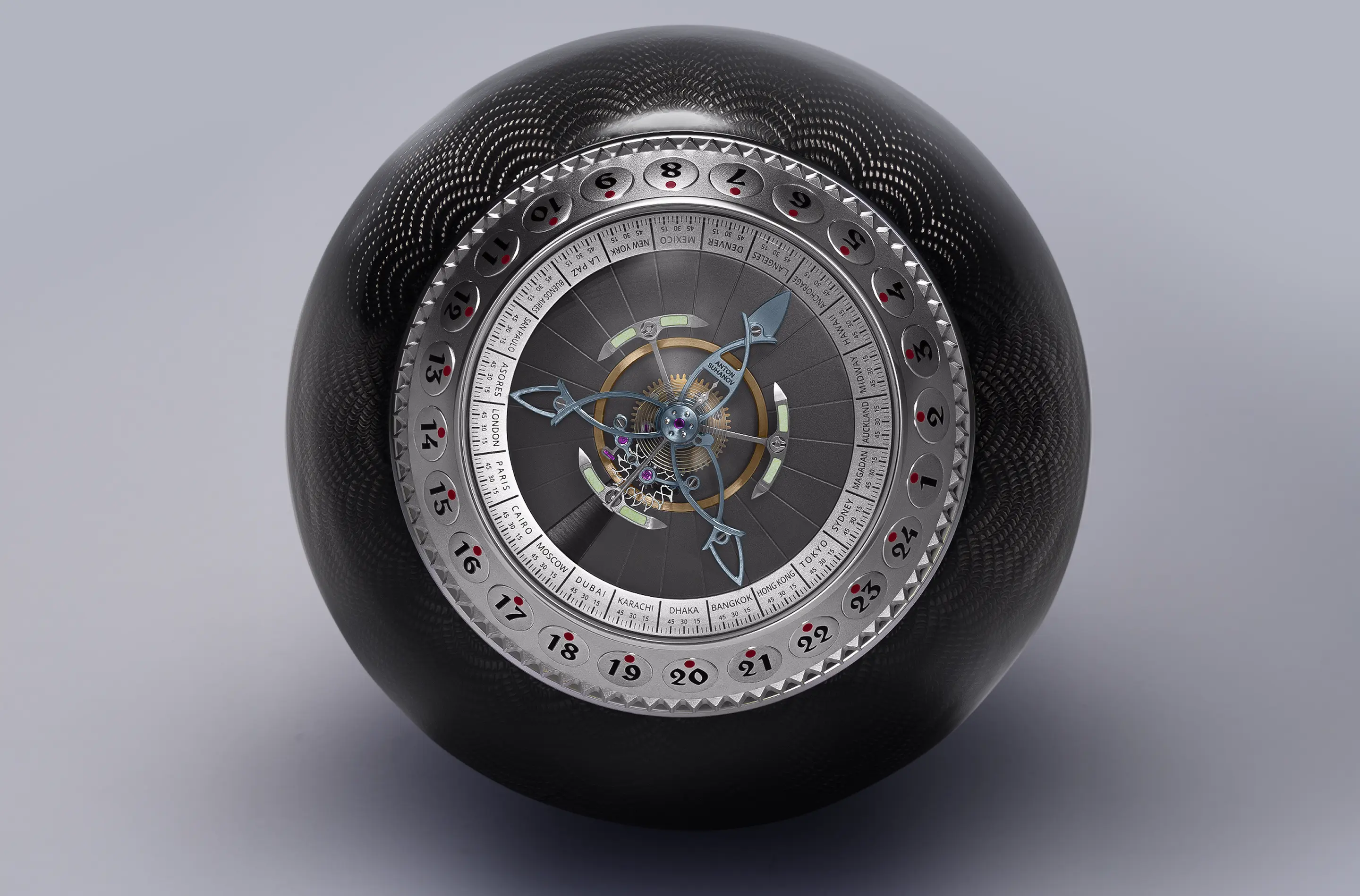 Традиционная форма индикации времени с вращающимся кольцом, применяемая в часах начиная с эпохи Ренессанса (этот классический дизайн также появляется в некоторых пасхальных яйцах Карла Фаберже, оснащённых часовым механизмом), дополнена изобретательно интегрированной в этот дизайн системой 24-часовой индикации мирового времени.