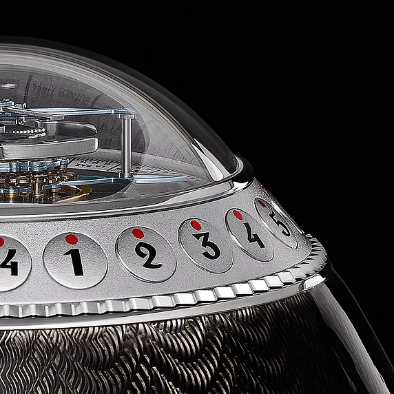 Единственная деталь, которая слегка выдаётся из безупречно гладкой яичной фигуры, – это ободок с насечкой и метками 24-часовой шкалы времени; также эта шкала позволяет отмерять секунды по вращению турбийона, который делает оборот ровно за 24 секунды. Поворачивая этот ободок, можно установить время – сразу во всех 24 часовых поясах. Сектор с московским (и петербургским) временем выделен радиальной шлифовкой, контрастирующей с отделкой остальных 23 секторов диска городов.