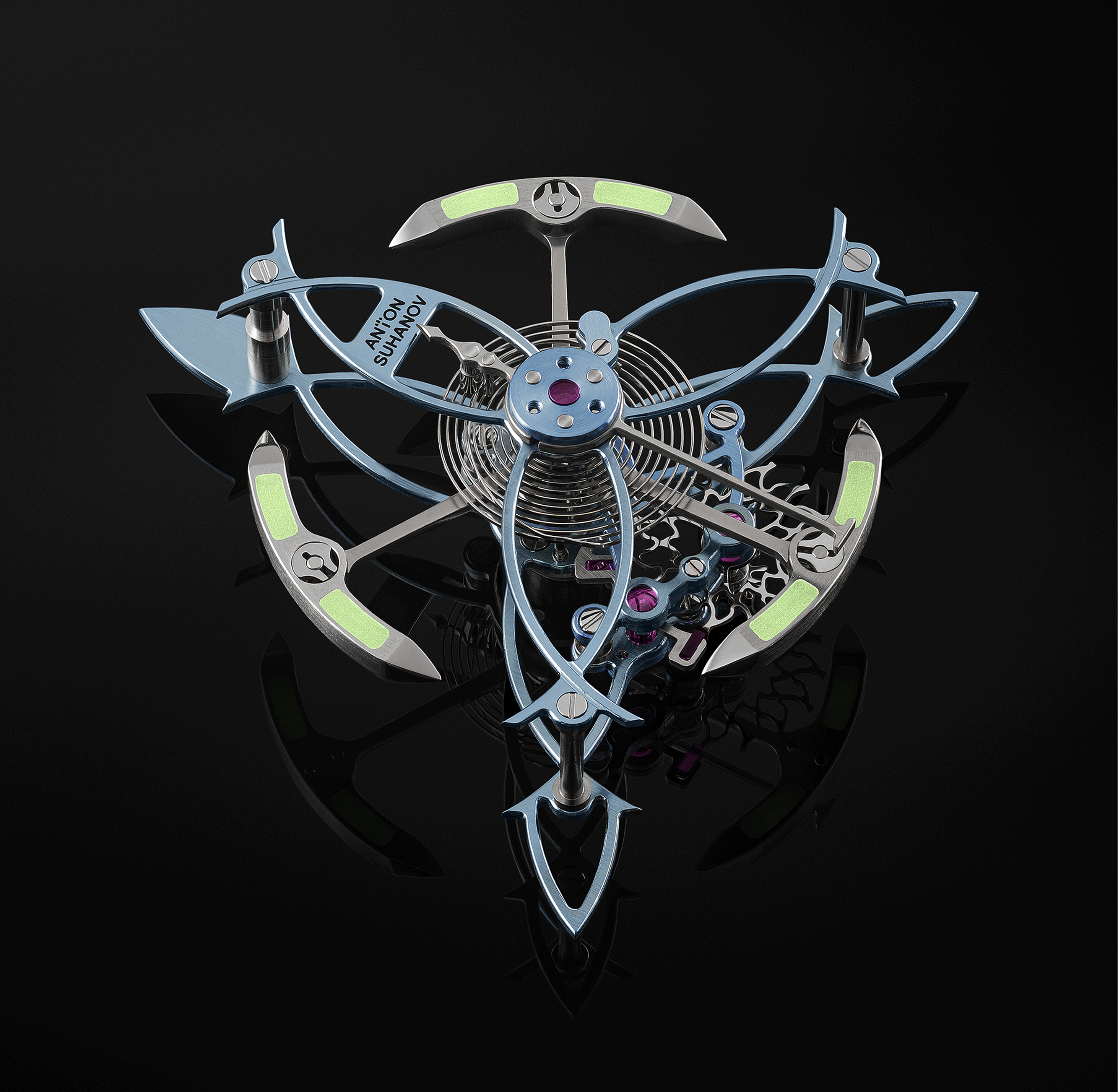 Турбийон, изобретённое 230 лет назад традиционное усложнение, выполнен Сухановым в подчёркнуто авангардном стиле с его фирменным «пылающим балансом» и кареткой в виде тройного бутона лотоса из титана небесно-голубого оттенка, полученного анодированием.