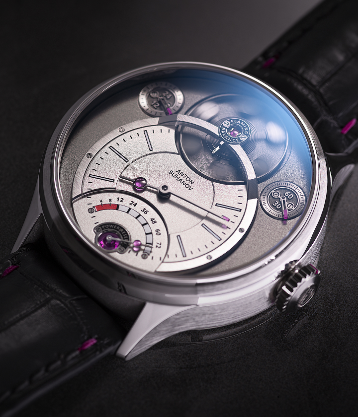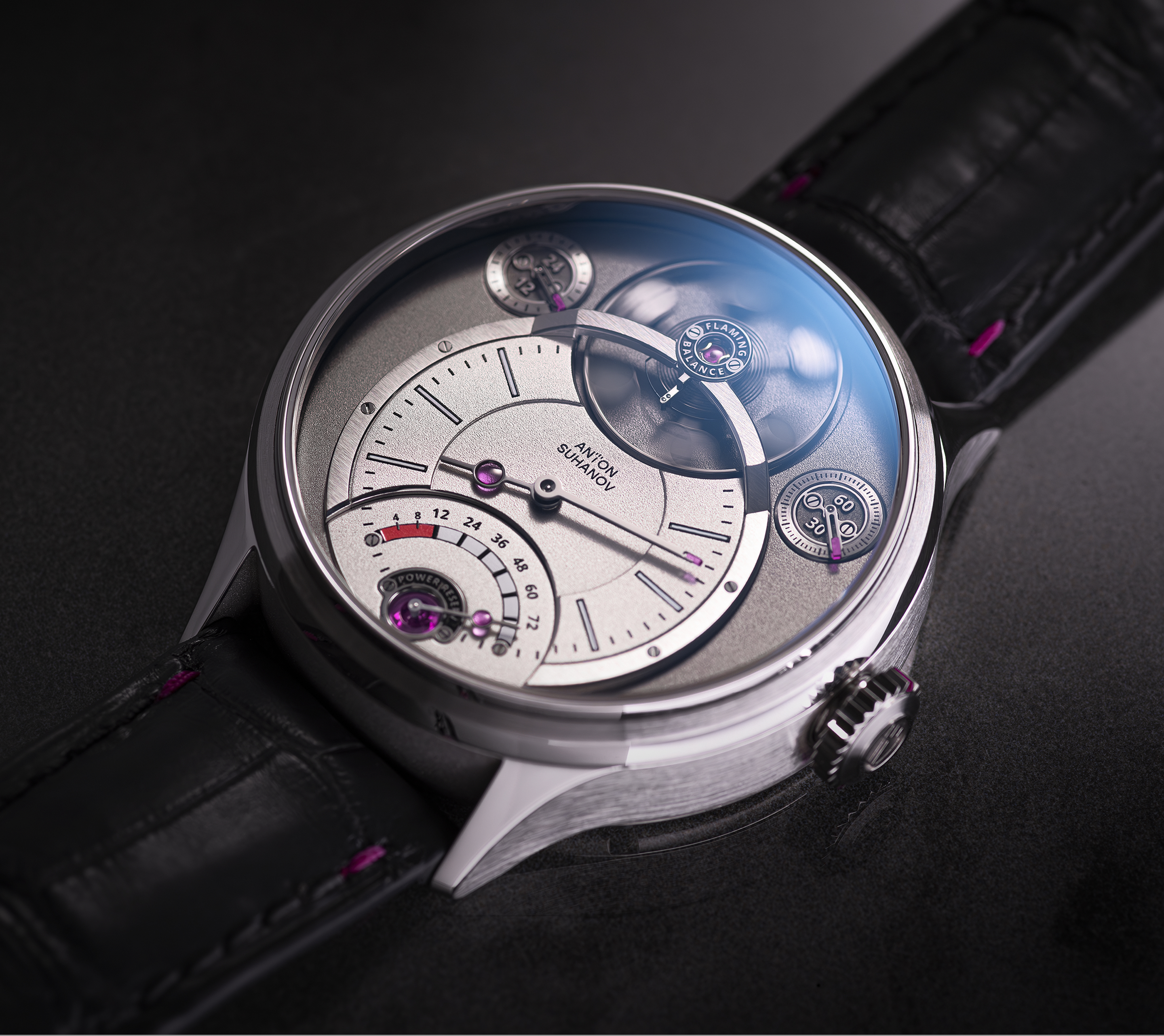 В модели «Фламинго» Антон Суханов реализовал редкий тип индикатора запаса хода с нелинейным отображением. Когда стрелка входит в красный сектор, соответствующий последним 12 часам запаса, её движение ускоряется вдвое. Это позволяет интуитивно считывать оставшийся запас хода и своевременно заводить часы. Индикатор отражает концепцию нелинейного времени, лежащую в основе подхода Антона Суханова. В часах «Фламинго» он воплотил идею неравномерного восприятия времени — чем меньше его остаётся, тем стремительнее оно течёт.