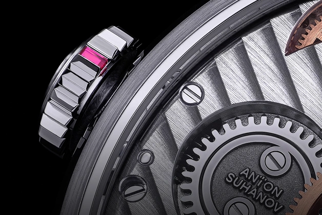 Рубиновые камни в стрелках становятся узнаваемым элементов фирменного стиля Антона Суханова. Наконечник часовой стрелки в форме лупы проходит над логотипом мануфактуры, а на конце минутной размещена рубиновая палета.